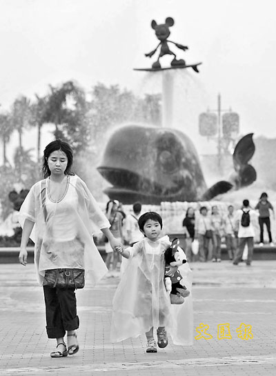 【本報訊】颱風吹襲下的迪士尼樂園,遊客掃興而回。多部露天機動遊戲「死機」、重頭節目卡通人物巡遊被取消、旅客在迪欣湖滑倒……盡是不歡快的經歷,部分人唯有提早離場。而今晚中秋夜已有大批旅客預購入場券,原料入場人數猶勝昨日,加上惡劣的天氣,混亂情況恐更甚。