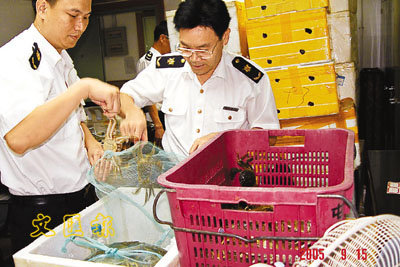 羅湖檢驗檢疫局人員查看檢獲的走私蟹。 本報深圳傳真