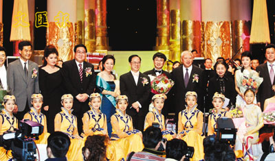曾蔭權、董建華、高祀仁、梁愛詩、李剛、梁振英等上台向晚會表演者祝賀演出成功。 劉國權 攝