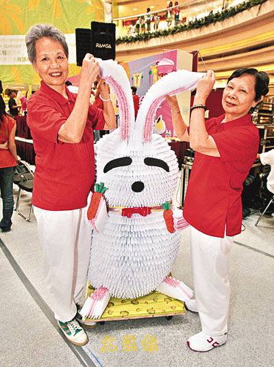 有份摺大白兔的陳婆婆說,各個中心都有很多長者參與,過程中最辛苦的是將摺好的紙砌成形體,既要黏膠水,又不可以一高一低。「兔子中心有紙皮箱支撐,砌幾層就要加一層紙皮,要不然好易散。2隻手上的蘿蔔是我們自己再添上去的,一個蘿蔔就要幾百張紙,希望可以讓人們開心,等人們見到都開心。」經過20多日努力,大白兔終趕及在前日下午完成,稍後將在耆康會30間院舍巡迴展覽。 張立新 攝