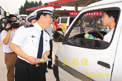 當日下午,廣東省公安廳交管局夏濤副局長帶領20多名警務人員在廣州高速公路廣氮收費站入口發放安全資料(見圖)。