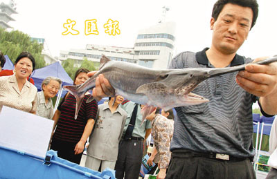 20日,一位鄭州農民在鄭州市農業局主辦的第二屆名優特新農產品集中展銷活動中,展示自己魚塘養的水產品。 中新社
