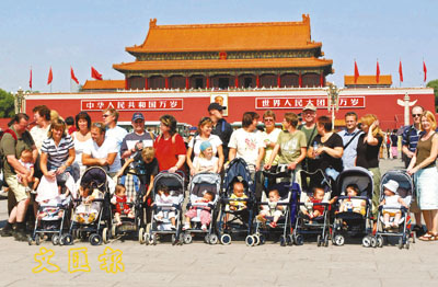 挪威認養中國兒童家庭會聚北京天安門合影。22日,一對來自挪威的認領中國兒童的旅遊團體,攜帶著11名中國幼兒,會聚北京天安門廣場,合影留念。 中新社