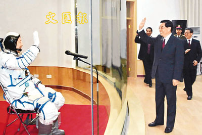 ■2003年10月15日,胡錦濤等領導向即將出征的首飛航天員楊利偉揮手致意。資料圖片