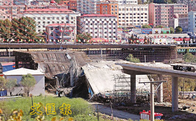 黑龍江綏芬河一在建立交橋發生坍塌事故,圖為9月25日拍攝的坍塌事故現場。當日清晨5時許,黑龍江省綏芬河市一座在建立交橋在澆築混凝土時發生坍塌事故,至少造成1人死亡、6人受傷。 新華社