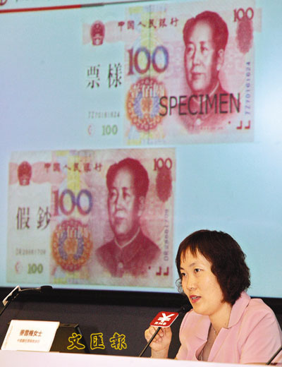 中國銀行(香港)營運部副總經理施龍妹昨出席「人民幣現鈔防偽講座」時透露,中銀清算行截至上月,今年已檢獲89張人民幣偽鈔;去年自經營人民幣業務起,全年檢獲79張偽鈔,涉及金額超過人民幣7200元。雖然檢獲人民幣偽鈔上升逾一成,但中銀營運部表示偽鈔問題不太嚴重,因為隨著防偽的知識及技巧提高,相信偽鈔個案會越來越少。