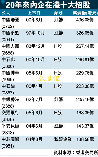 20年來內企在港十大招股 (圖)