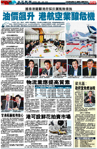 【本報訊】(記者 麥沛天、林德芬)國際油價飆升,雖未導致全球經濟出現衰退,但對油價相當敏感的航空業而言,情況可謂已到危急存亡之秋,加上鄰近地區開放天空,令香港航空業面對更大的隱憂。航空界盼港府採取措施,維持本港現有優勢,擴展及優化以內地市場的航空網絡,保住中國航空南大門的地位,已成為當前急務。