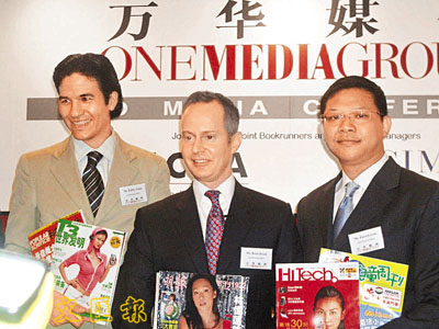 【本報訊】(記者 吳文爾)明報企業(685)旗下萬華媒體(0426)今起公開招股,按1至1.25元發售1億股,其中九成國際配售,一成公開發售,集資額介乎1至1.25億元,於10月18日在主板上市。萬華是次集資所得約47%將用於收購及拓展內地雜誌業務;24%用於推廣美國音樂文化雜誌《RollingStone》中文版及新版《明報周刊》;12%用於新雜誌發行相關活動,餘下12%及5%分別用於償還銀行短期債務及一般營運資金。