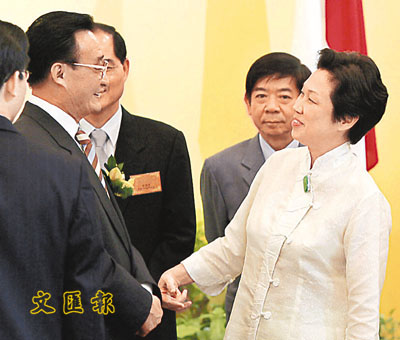 總理夫人的特殊背景,令何晶(右)在中國的待遇,超越了一般商企行政總裁。圖為何晶今年五月與中國人大委員長吳邦國會面。 資料圖片