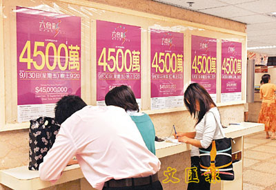 「黃金周連環巨獎」打頭陣的六合彩攪珠今晚舉行,若頭獎一注獨得獎金可高達4500萬元。 張立新 攝