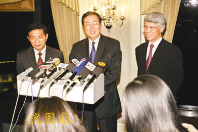 周小川(中)與任志剛(右一)、和廣北(左)接受記者訪問。張偉民 攝