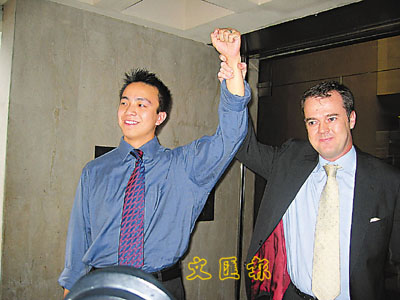 同性戀者肛交被判合法,同性戀男子梁先生(左)與律師舉起勝利手勢。 資料圖片