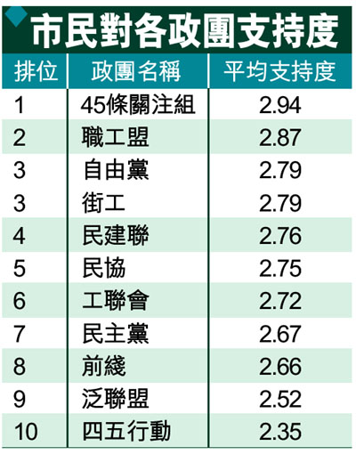 此外,民建聯憑著0.07較佳升幅,由8月份第7位,躍升至第4位,排名僅次於自由黨和街工,而民主黨也憑最多的升幅超越前線,居身7位,值得留意的是,四五行動是唯一支持度低於2.5分的政團,以2.35分排在榜末,當中更有3成6受訪者表示「非常不支持」,相信與市民不支持其成員長毛(梁國雄),訪粵期間過激的言行,擔心會影響和諧溝通氣氛有關。