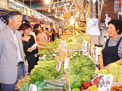 保安局局長李少光昨日到訪九龍城區,在九龍城街市與一名蔬菜檔主傾談。李少光亦聽取了九龍城區議員及居民就地區議題包括治安情況的意見。