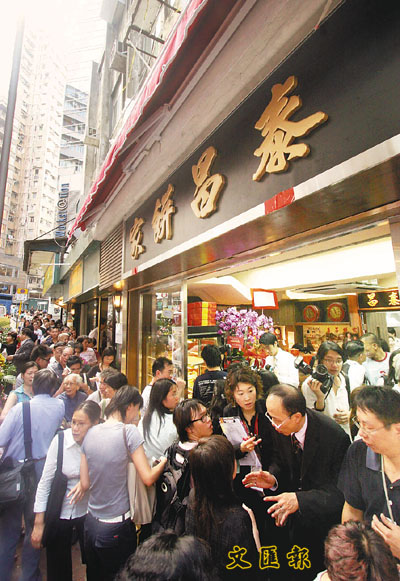 在中環有50年歷史的泰昌餅家早前因業主大幅加租一度結業,昨與新伙伴於擺花街舊舖原址斜對面高調復業,吸引大批傳媒及街坊到場,警方加派人手指揮交通並封鎖擺花街部分路面以策安全,全日場面雖混亂但溫馨。復業首天餅家門外已吸引長長人龍,為免顧客空手而回,餅家昨日亦如結業日般限制客戶只可購買半打蛋撻,同一措施,4個月後卻由離愁別緒變成喜氣洋洋。