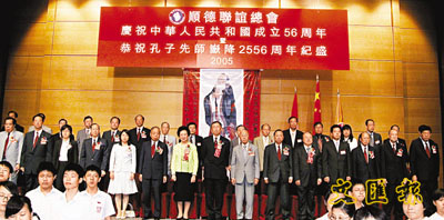 【本報訊】(記者 鄭群)順德聯誼總會日前假灣仔香港會議展覽中心舉行盛大聯歡晚宴,隆重慶祝國慶56周年暨大成至聖孔子先師嶽降2556周年誕辰紀念,特邀中聯辦副部長周志榮,中西區民政事務專員尤桂莊蒞臨主禮。順德聯誼總會同仁及該會轄屬13校校監、校董、會董、校長及教職員與各界嘉賓濟濟一堂,同申慶賀,舉杯共祝祖國繁榮昌盛,香港市民安居樂業。
