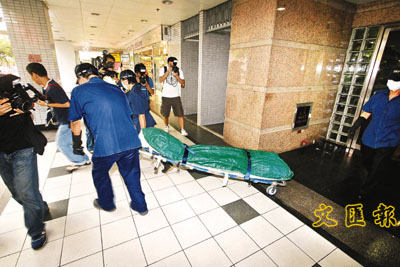仵工將男死者的遺體舁送殮房。 蔣焯文 攝
