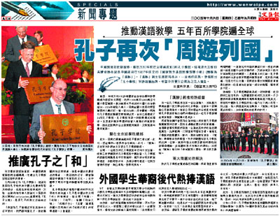 他相信,孔子學院應該能形成一定的回報,但初期的三到五年內,需要國家財政的大力支持。不少國家的語言推廣機構每年推廣經費達幾十億美元,而目前中國對孔子學院的投入僅六七千萬人民幣。所以說,投入問題並未完全解決。「漢辦」希望有更多的投入,加快漢語走向世界的步伐。 ■資料來源:《瞭望東方周刊》