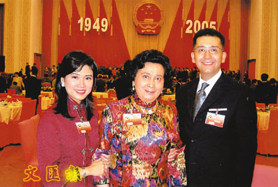 滿威利基金會創立人何婉琪(中)精神奕奕在兒子何東舜銘及兒媳陳復生陪同下,應國家領導人之邀,參加於北京人民大會堂舉行的國慶活動。