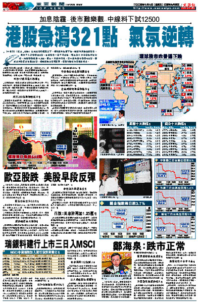 恆指昨日收報14,839點,大跌321點,跌幅為2.12%,是十七個月來最大單日跌幅。自美聯儲局發表加息言論後,恆指兩日共挫543點。成交額昨日高居260億元。期指更由高水轉低水,收報14,809,下跌361點,低水30點。
