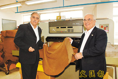 Landes專為牛仔服裝行業製造真皮和仿皮標籤及皮邊。圖為Landes行政總裁邵耀道(左)向投資推廣署署長盧維思介紹製造皮革標籤的工序。