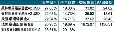 佔近三個月榜首的美林世界礦業基金,基金在2002、2003和2004表現分別為29.04%、72.37%及10.36%,基金最差季度收益和標準差為-22.18%及22.95。