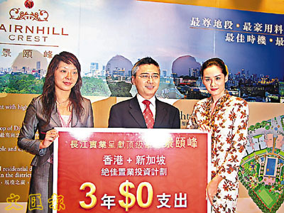 長實高級營業經理黃思聰(中)與營業及市場經理封海倫(左)及來自星洲的美女,推介星洲豪宅景頤峰。梁悅琴 攝