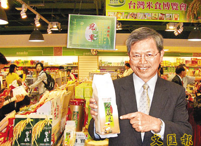 台灣農委會10月7至17日在香港舉行「台灣米食博覽會」促銷活動,推出各種無污染的優質米,迎合港人需求。圖為香港台北貿易中心董事總經理徐秋雄推銷剛獲得「台灣稻米品質競賽冠軍」的池農米,每公斤售價2,560港元。 中央社