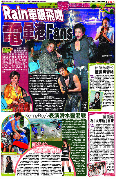 【本報訊】(記者 李思穎)在亞洲市場冒起的韓國跳舞天王Rain,昨晚在會展中心正式開騷,這是他首次在港開個唱,演唱會賣座情況當然理想,兩場門票早已售罄,昨晚七千八百個座位爆滿,Rain事先表明要獻給香港歌迷難忘晚上,果然他在台上大耍?功,向歌迷大送飛吻,作出單眼、伸?等可愛動作,頻頻「放電」,搞到女Fans伊嘩狂叫,他亦大叫現場觀眾盡情歡呼,令氣氛非常熱烈!
