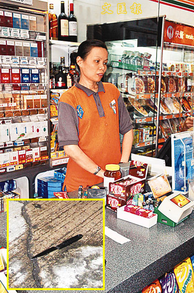 ■勇退無膽匪的便利店女職員。小圖為匪徒遺下利刀。