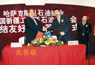 【本報駐新疆實習記者李若竹、通訊員姜鄆東烏魯木齊電】日前,新疆工商聯石油業商會與哈薩克斯坦石油商會在新疆銀都大酒店正式簽定協議,雙方確定自2005年9月29日起建立友好商會關係,新疆工商聯石油業商會會長陳環英興奮地說:「這是新疆民營石油業走向國際的第一步,也是在全國石油業民間商會中第一個與國外建立聯繫的。」