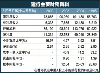 根據2005年的預估盈利,建行的招股價1.9-2.4港元,約相等於1.7-2.0倍2005年P/B,如以其約15.3%的股本回報率來說,比同業(特別是交通銀行)更為吸引。
