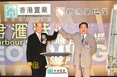 新地周國賢(右)稱,君匯港昨已獲售樓紙。 周穎 攝