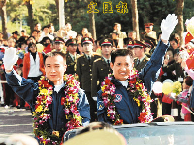 ■神六航天雙雄在北京航天城站在一輛開篷轎車上接受人們的歡迎和祝賀。新華社