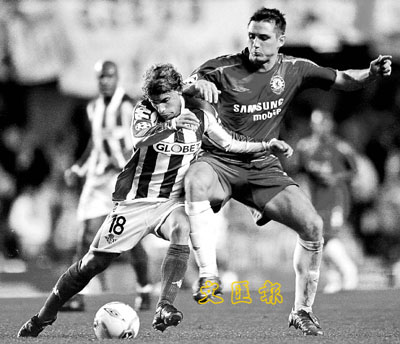 車路士中場林柏特與貝迪斯中場李維拉爭奪皮球。 法新社
