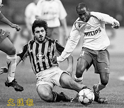 AC的加度素拚命踢去比士利的腳下球。 路透社