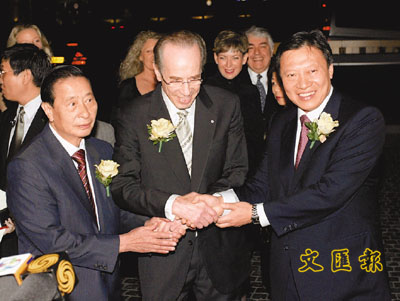 四季酒店開幕,左起:恆基主席李兆基,四季酒店集團創辦人、主席及行政總裁Isadore Sharp及新地主席郭炳湘。 本報記者張偉民 攝