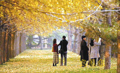 乍寒還暖,北京街頭的樹葉變成金黃,落葉繽紛的美景引得遊人流連忘返。