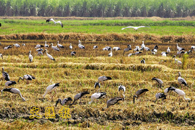 ■泰國政府表示,泰國各地已加強措施防範禽流感。圖為鸛鳥在泰國西部北碧省一稻田上覓食。 法新社