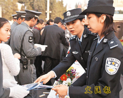 22日,北京警方舉行《北京市大型社會活動安全管理條例》宣傳月啟動儀式,並向民眾發放宣傳材料。 中新社