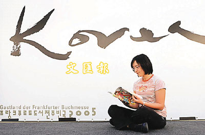 ■韓國學生在法蘭克福書展閱讀韓國書籍。 美聯社