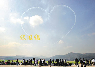 首爾航空展後,天空高懸一顆心,難道是機師乘機向心上人示愛?(美聯社)