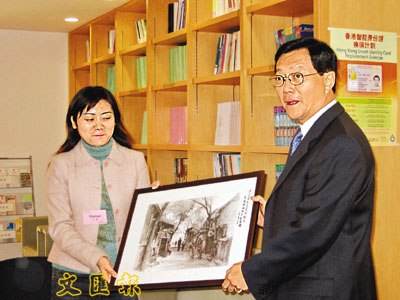 駐京記者派出代表向梁寶榮送上北京胡同素描一幅。本報北京傳真