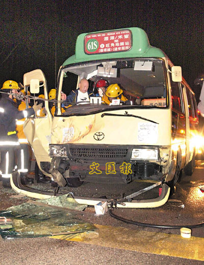 昨凌晨3時23分,一輛行走沙田禾輋h至旺角地鐵站的空載專線小巴,由60歲姓陳司機駕駛,沿獅子山隧道公路出九龍,至距離收費廣場100米處,疑未有察覺前方兩輛工程車正慢駛在路面吸塵,結果煞掣不及狂撼其中一輛箭嘴工程車車尾。