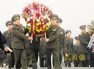 25日,在中國人民志願軍抗美援朝赴朝參戰55周年之際,朝鮮人民武力部代表在平壤向朝中友誼塔敬獻花圈。新華社