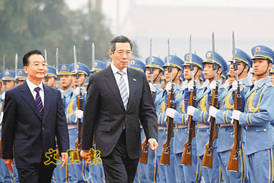 ■25日,中國國務院總理溫家寶在北京人民大會堂外廣場歡迎來訪的新加坡總理李顯龍。中新社