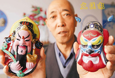 河北工藝美術大師任玉德,結合剪紙製作手法,設計製作出一種彩繪鏤空泥臉譜。這是他設計製作的「關公」(左)、「鍾馗」(右)泥臉譜。 新華社