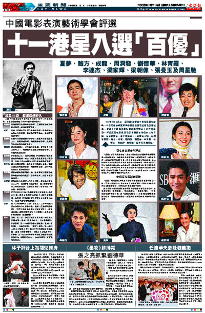 【本報訊】(記者 黃佩麗)為慶祝中國電影百年盛典,中國電影表演藝術學會經國家廣電總局電影局批准,主辦「中國電影百年百位優秀演員」的評選活動。評選範圍包括我國電影各個歷史階段的大陸及港、台全部演員。其中香港有十一位演員入選,他們是夏夢、鮑方、成龍、周潤發、劉德華、林青霞、李連杰、梁家輝、梁朝偉、張曼玉和周星馳。