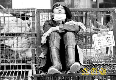 雖然禽流感來勢洶洶,但北京一名雞販無懼危險,靠在雞籠上睡覺。 路透社